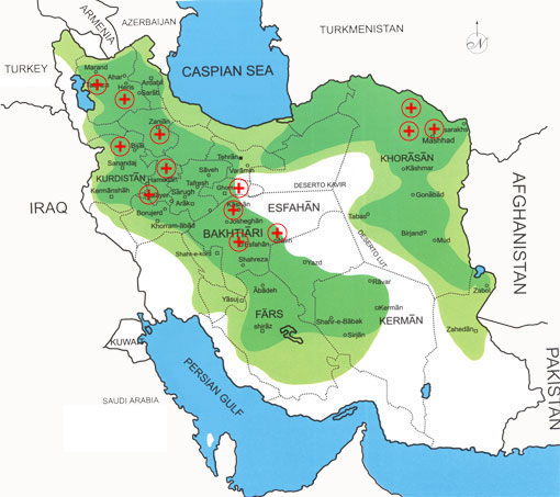 Tabriz | Heris | Zanjan | Bijar | Hamedan | Malayer | Kashan | Esfahan | Nain | Lilihan | Qom | Abadeh | Ghashghai | Mashhad | Ghouchan and Sarakhs | Turkoman rugs | Ferdous